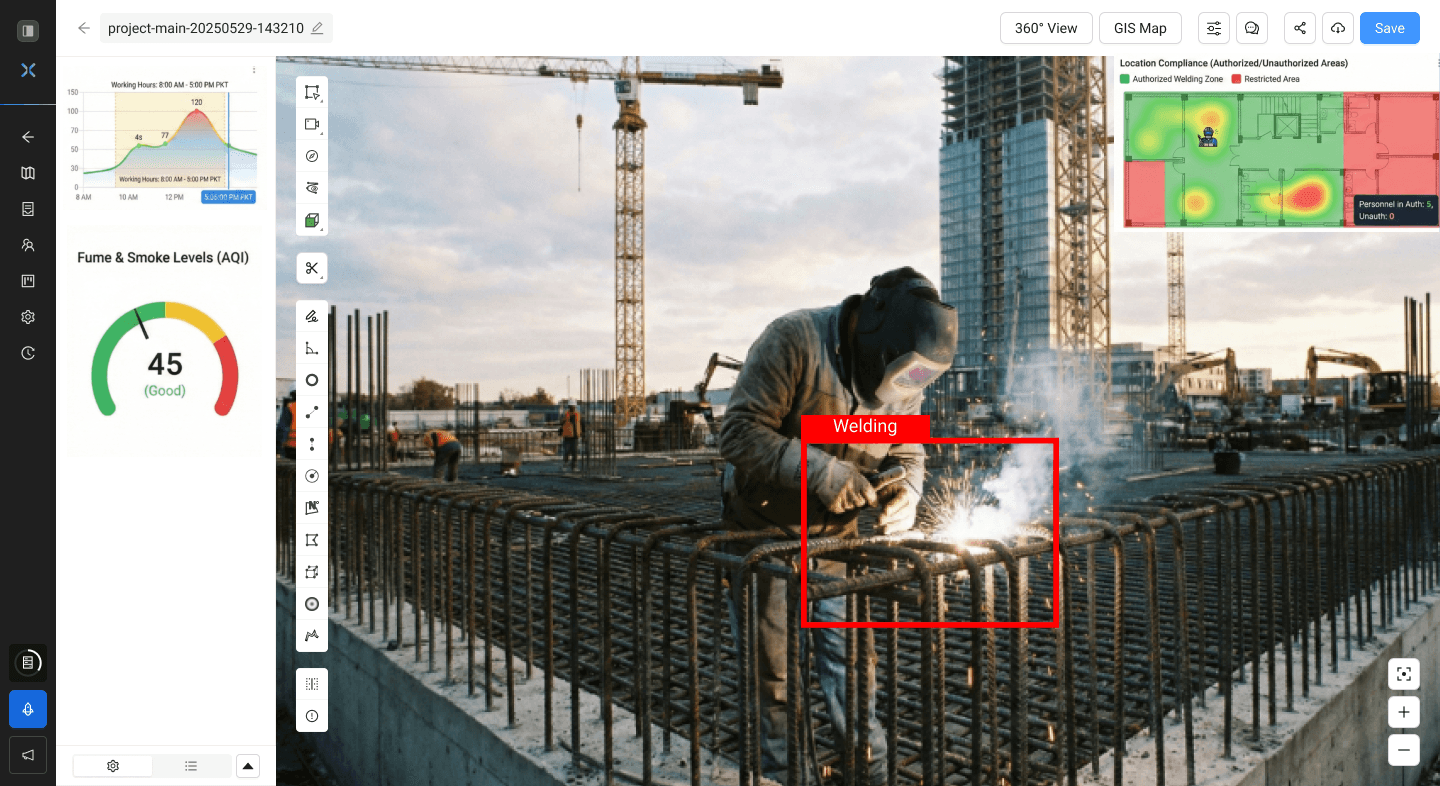 Another example is wielding activity monitoring where SpatialSense can detect all welding activities giving you insights like flagged hot-work outside authorized hours, logged events with timestamp & location for compliance, identification of fire, smoke, and unsafe intrusions giving you alerts to prevent safety incidents.