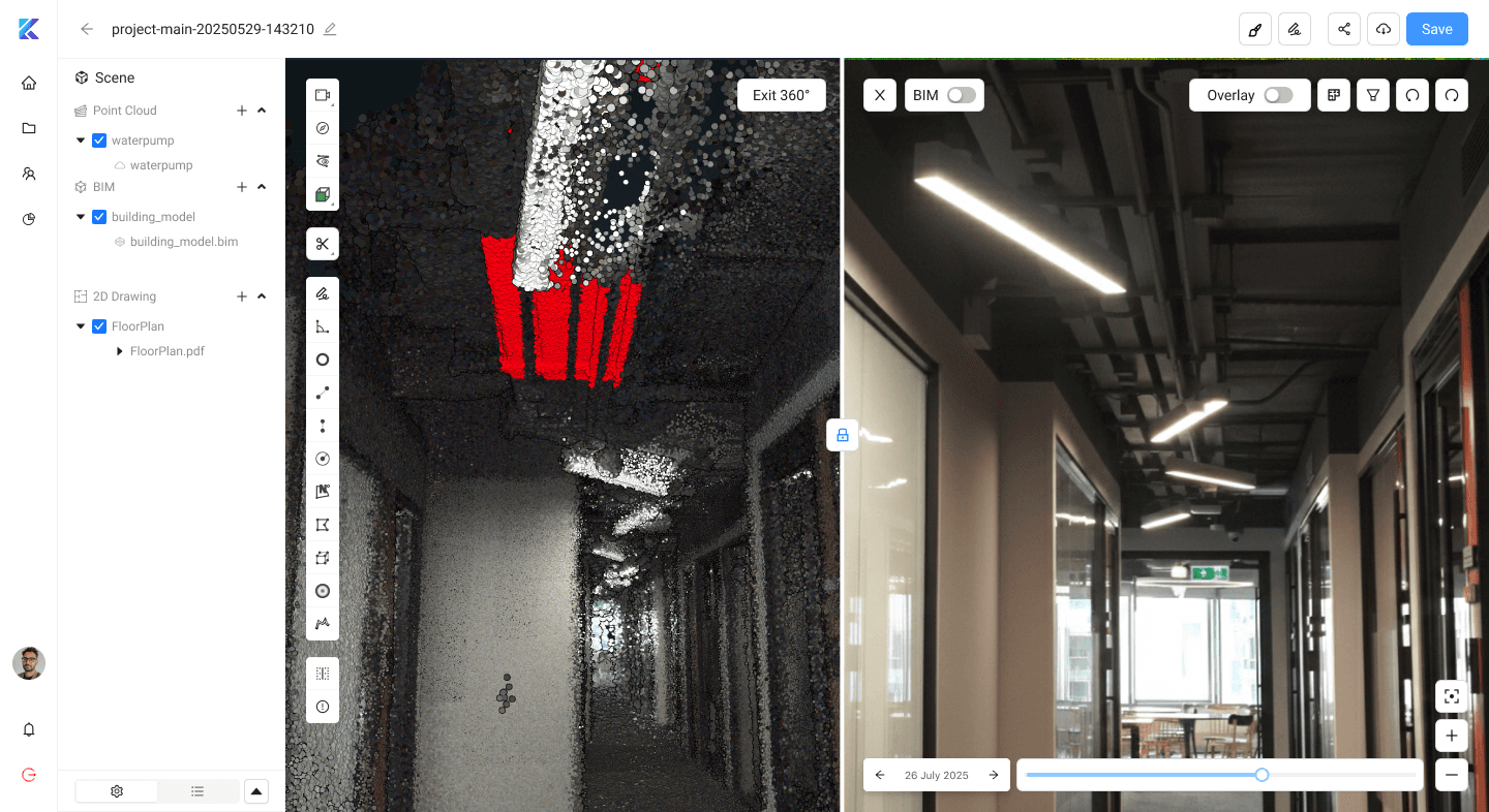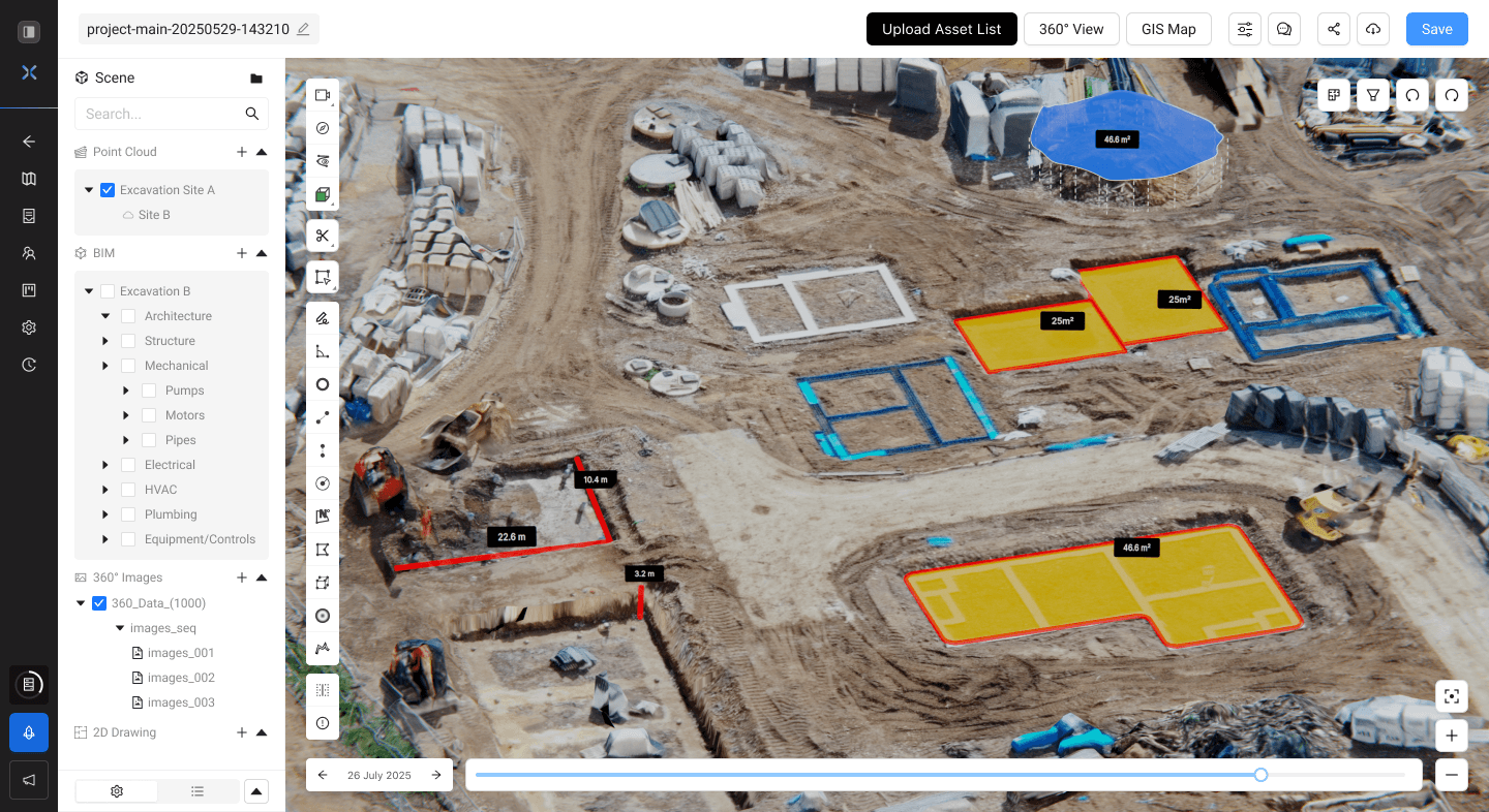 Pairing hardware system like 4DRC’s fixed-point scanner & Spatial Scanner’s portability 4D Digital Twins can be generated which SpatialSense then utilizes to monitor and inspect excavation volumes. Cut/fill progress is tracked and compared with design plans.